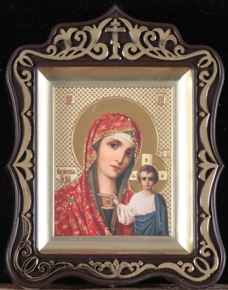 Икона в пластмассовой рамке Киот 6х7 резной латунированный Казанская БМ