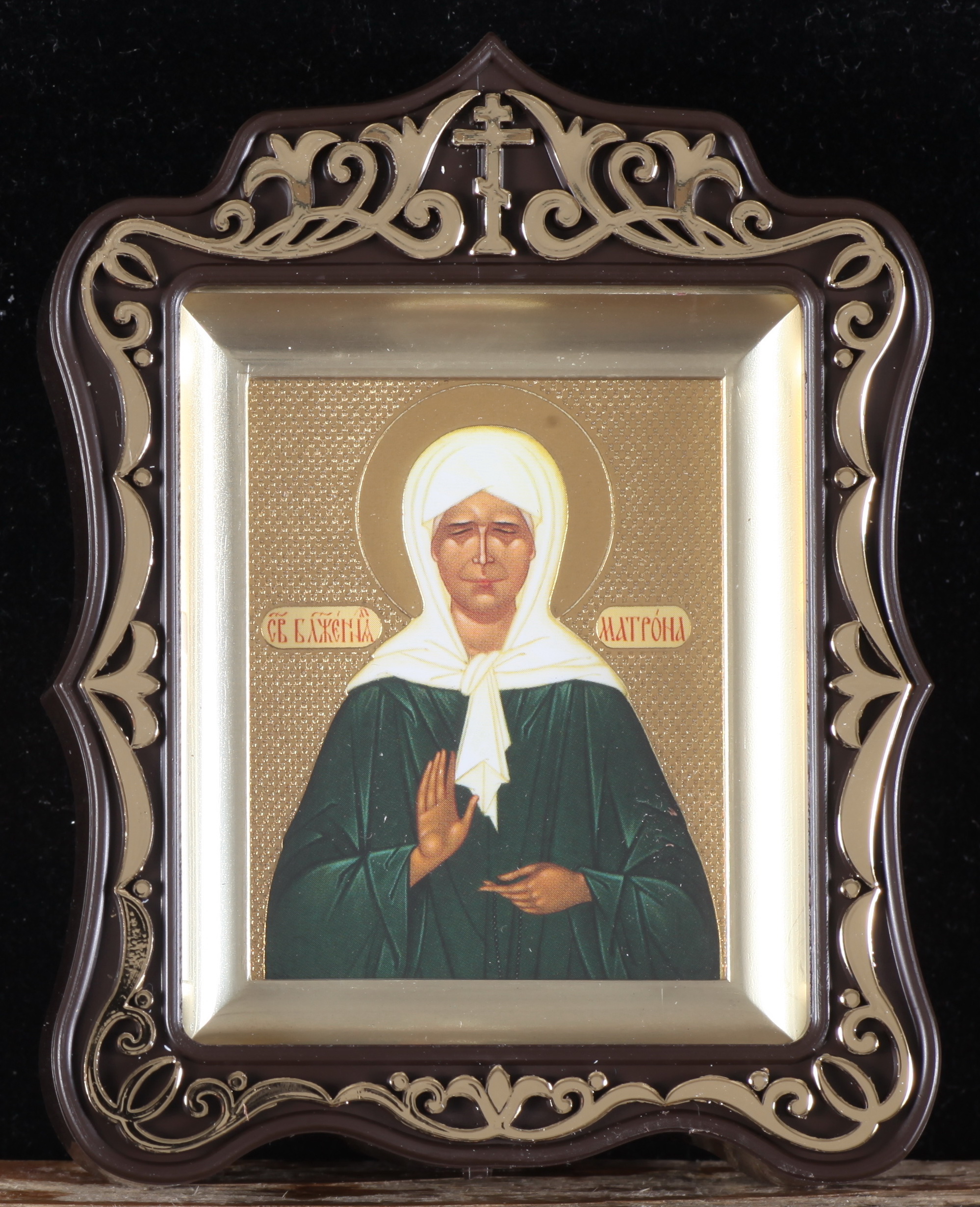 Икона в пластмассовой рамке Киот 6х7 резной латунированный Матрона Московская (с венчиком)