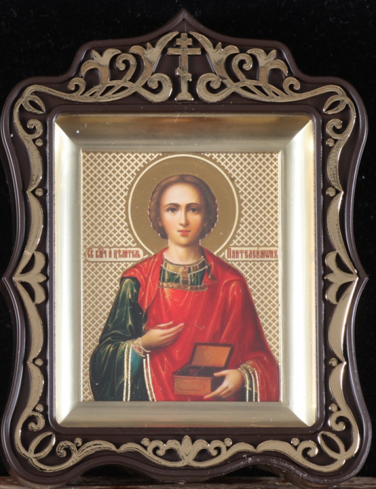 Икона в пластмассовой рамке Киот 6х7 резной латунированный Пантелеимон
