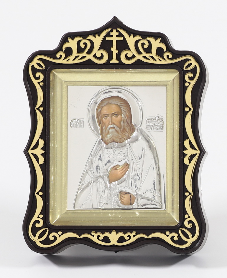 Икона в пластмассовой рамке Киот 6х7 резной латунированный с ризой Серафим Саровский
