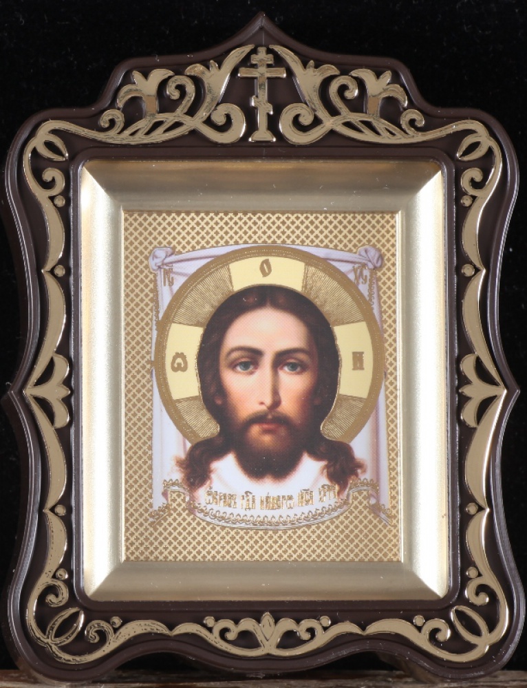 Икона в пластмассовой рамке Киот 6х7 резной латунированный Спас Нерукотворный