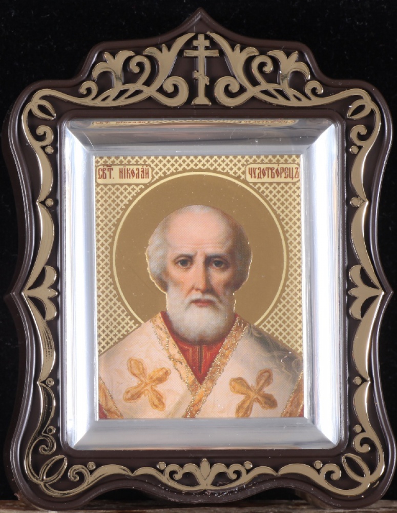 Икона в пластмассовой рамке Киот 6х7 резной металлизированный Николай Чудотворец
