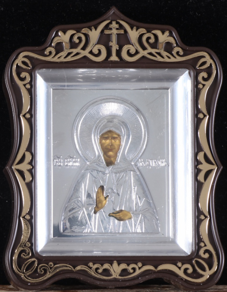 Икона в пластмассовой рамке Киот 6х7 резной металлизированный с ризой Матрона Московская (с венчиком)
