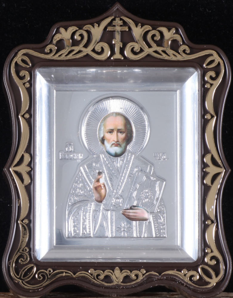 Икона в пластмассовой рамке Киот 6х7 резной металлизированный с ризой Николай Чудотворец