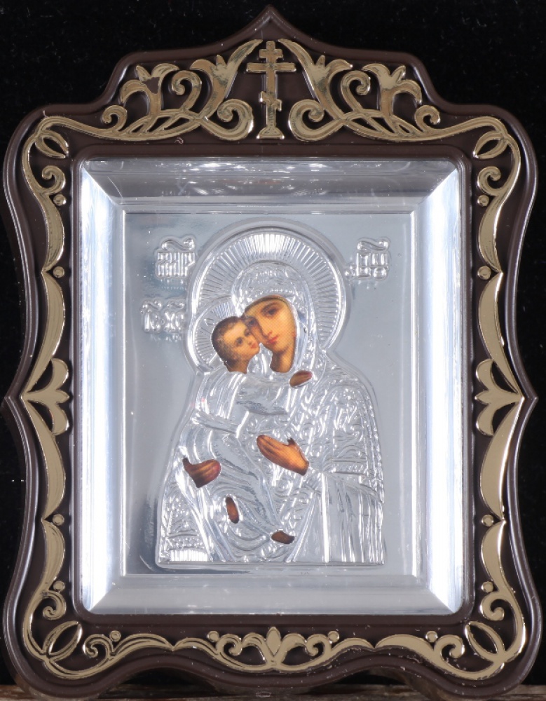 Икона в пластмассовой рамке Киот 6х7 резной металлизированный с ризой Владимирская БМ