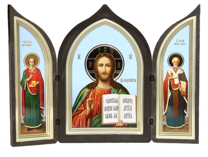 Икона в пластмассовой рамке Складень 12х18 тройной латунированный Спаситель-Пантелеимон-Николай Чудотворец