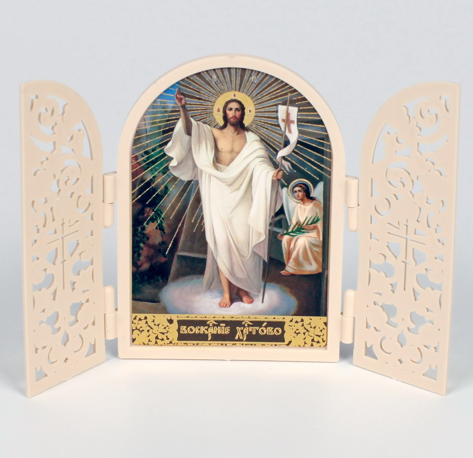 Икона в пластмассовой рамке Складень 5х7,5 арочный резной Воскресение Христово