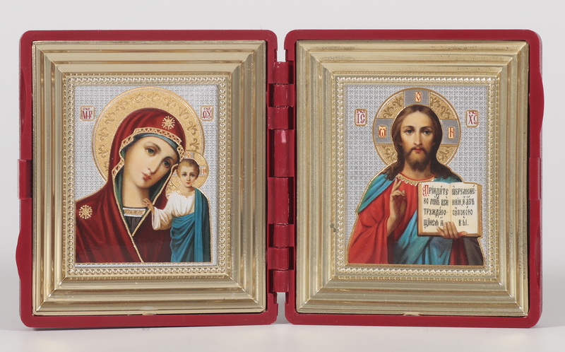 Икона в пластмассовой рамке Складень двойной 6х7 латунированный(тиснение) Спаситель-Казанская БМ 14