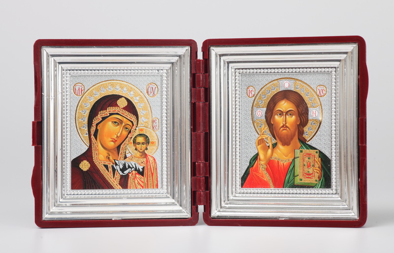 Икона в пластмассовой рамке Складень двойной 6х7 металлизированный(тиснение) Спаситель-Казанская БМ 10