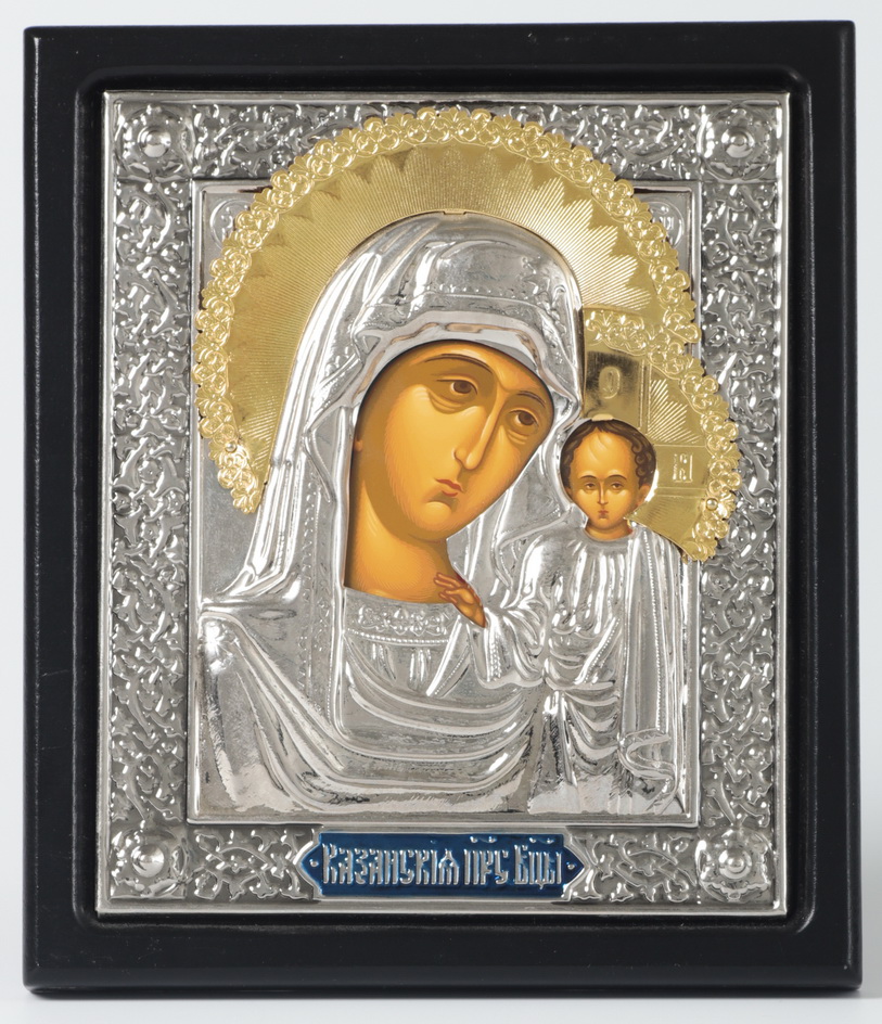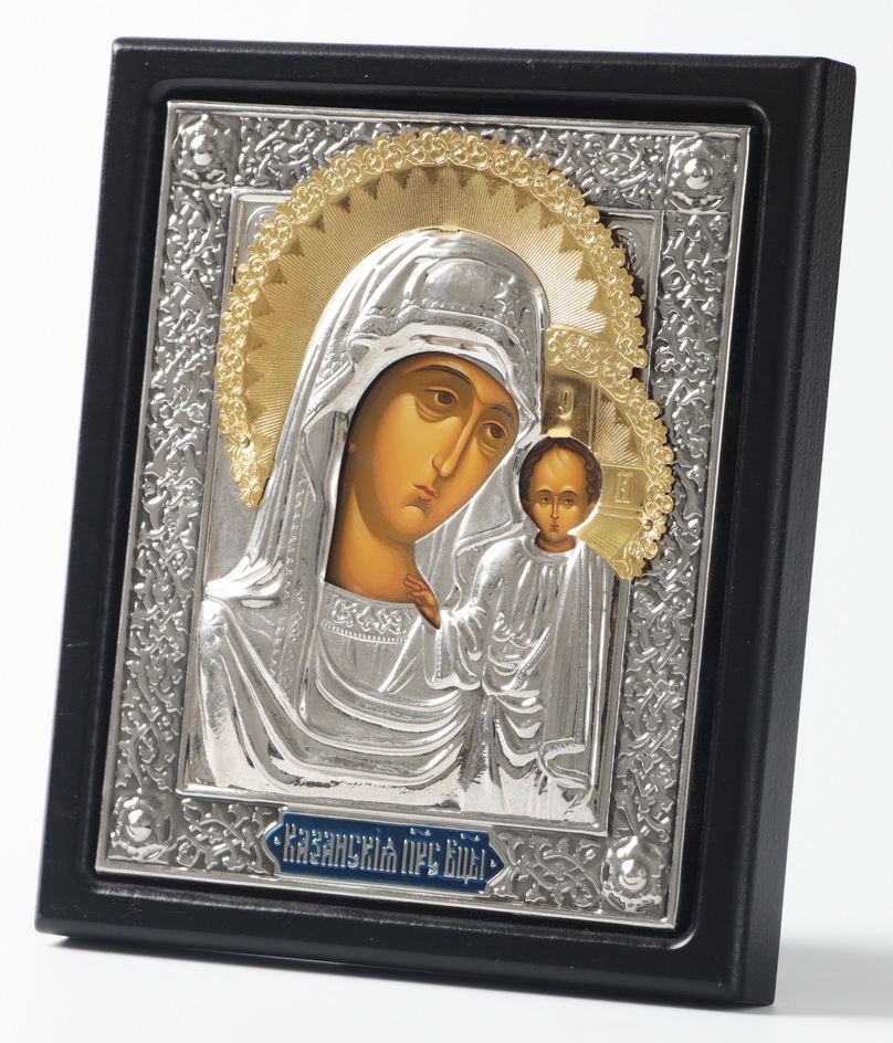 Икона в ризе 11х13 планшет, темпера, эмаль, никель, упаковка Казанская БМ