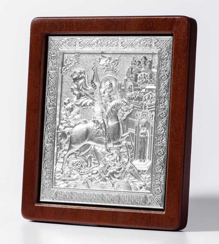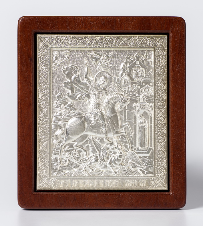 Святой великомученик Георгий Победоносец — почитался на Святой Руси с самого начала христианства. Небесный покровитель воинства и державной мощи Российского государства, он изображен на гербе города Москвы в доспехах и на коне, пронзая копьем змия, символизирует победу над дьяволом.