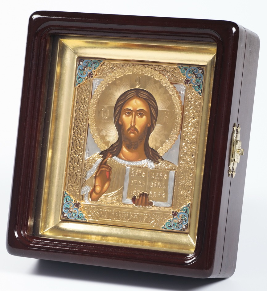 Икона в штампованном окладе 11*13 серебро эмаль на углах / киот / золочение / Господь Вседержитель (УИН)
