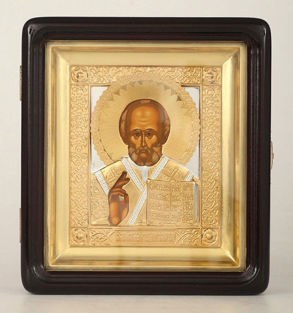Икона в штампованном окладе 11*13 серебро / киот / золочение / Николай Чудотворец (УИН)
