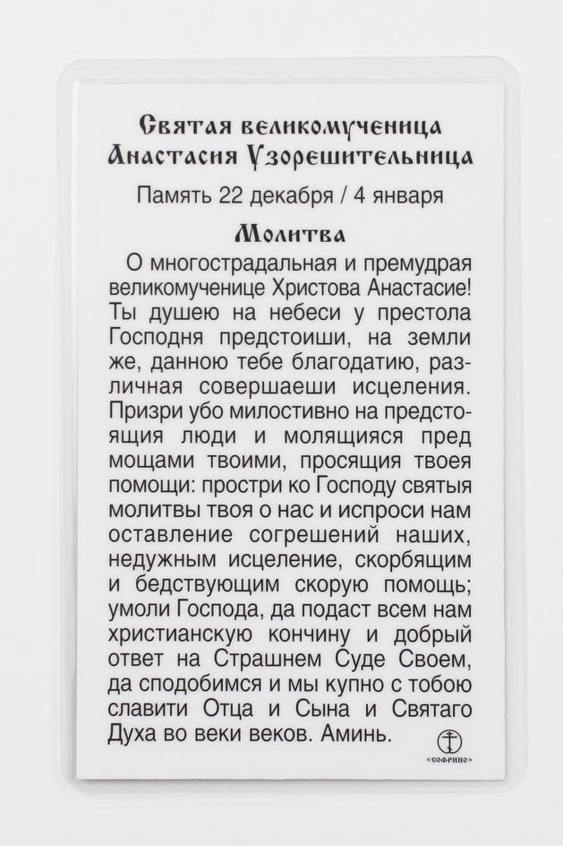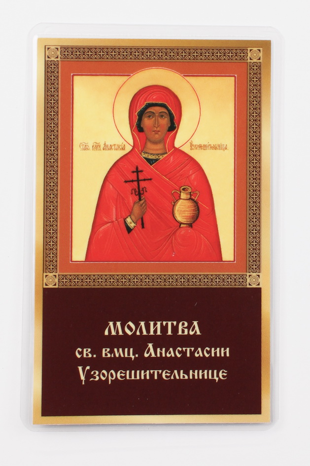 Икона в жесткой ламинации 5х8 с оборотом Анастасия Узорешительница