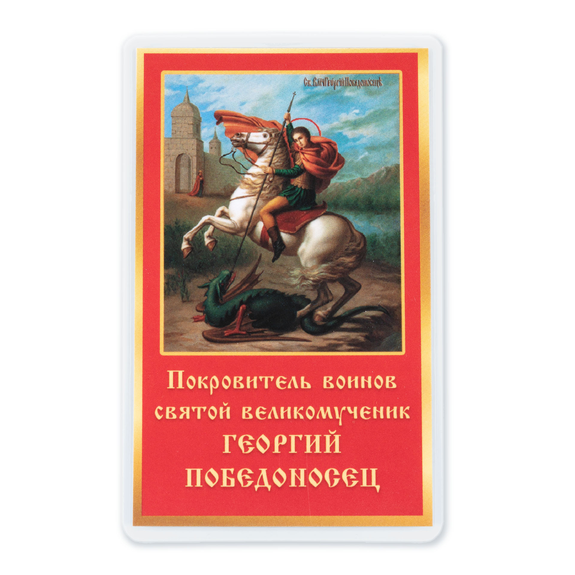 Икона в жесткой ламинации 5х8 с оборотом Чудо Георгия о змие