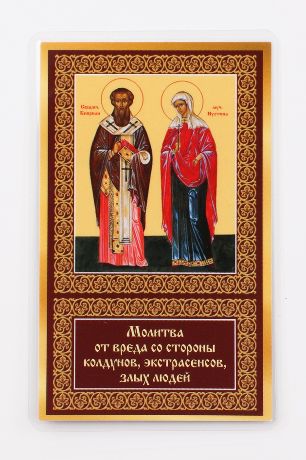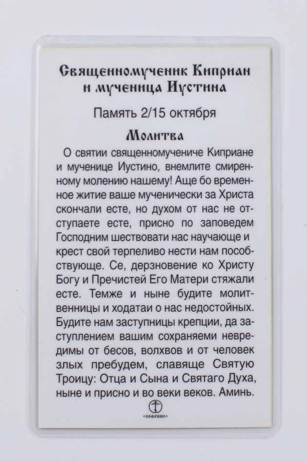 Икона в жесткой ламинации 5х8 с оборотом Киприан и Иустина