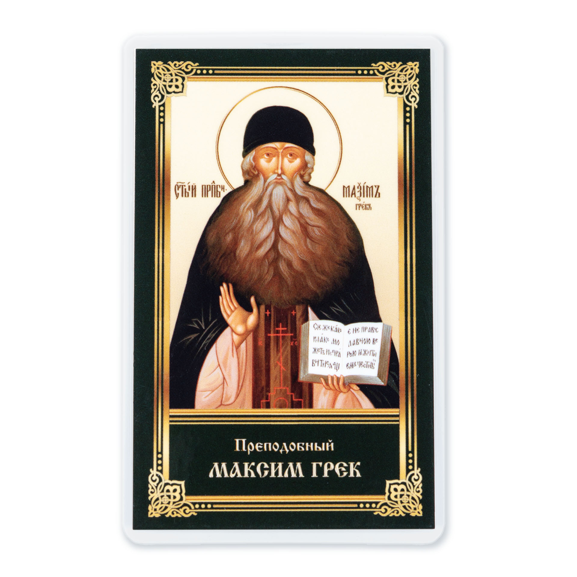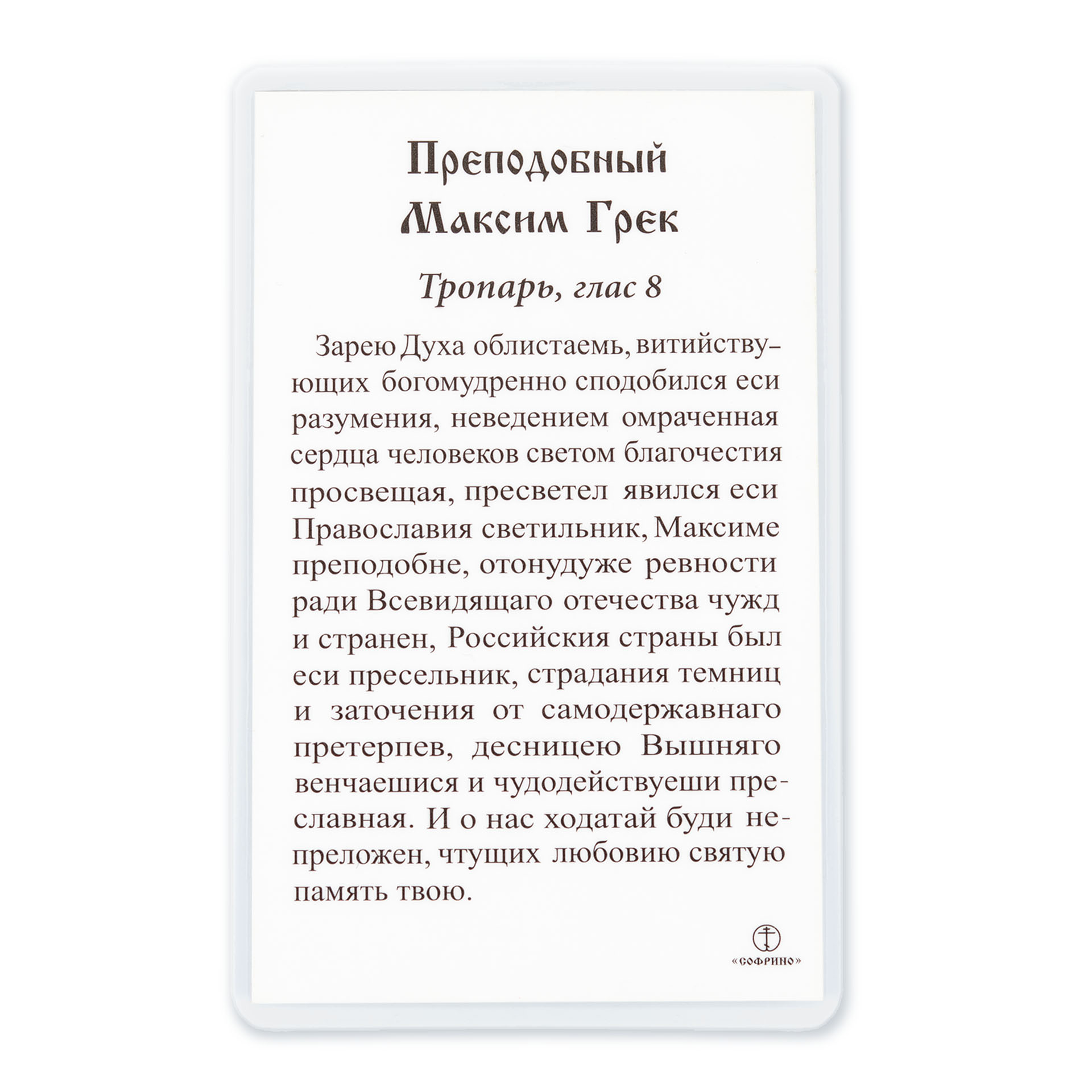 Икона в жесткой ламинации 5х8 с оборотом Максим Грек