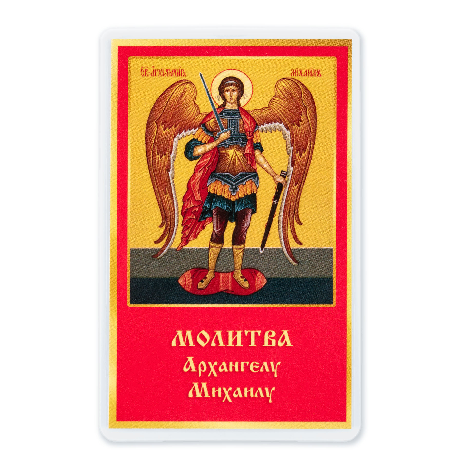 Икона в жесткой ламинации 5х8 с оборотом Михаил Архангел