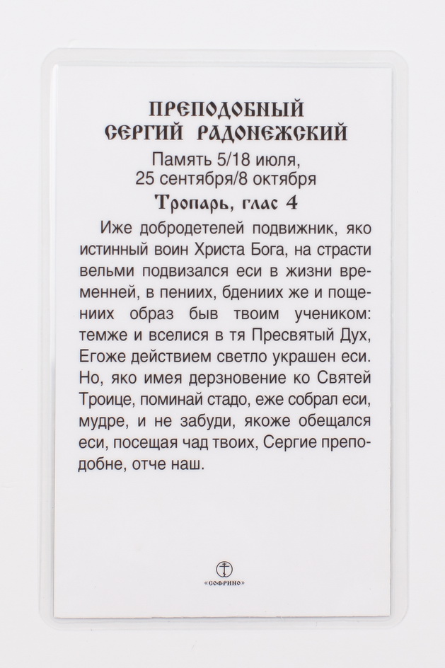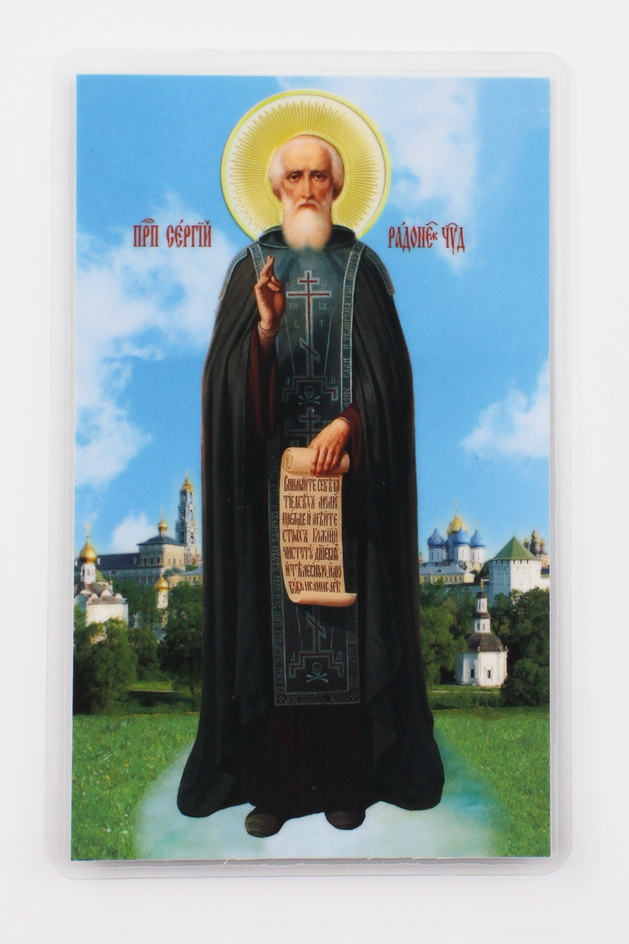 Икона в жесткой ламинации 5х8 с оборотом Сергий Радонежский (ростовой)