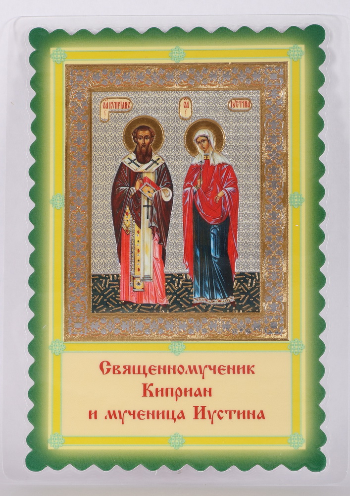 Икона в жесткой ламинации 8х11 с оборотом, двойное тиснение, высечка Киприан и Иустина