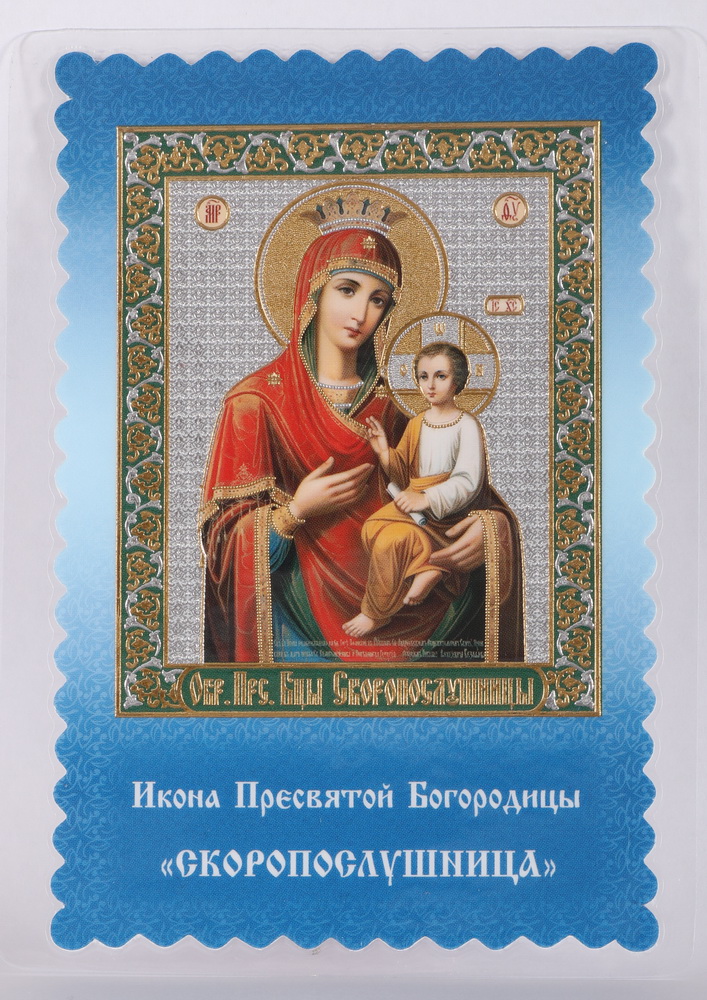 Икона в жесткой ламинации 8х11 с оборотом, двойное тиснение, высечка Скоропослушница БМ