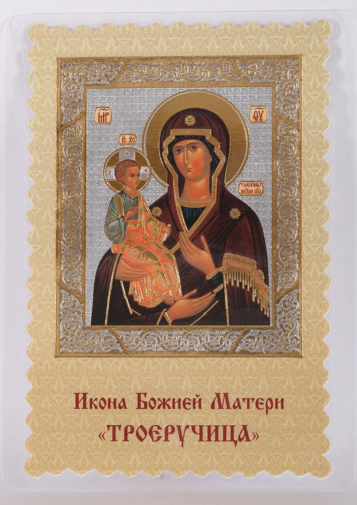 Икона в жесткой ламинации 8х11 с оборотом, двойное тиснение, высечка Троеручица