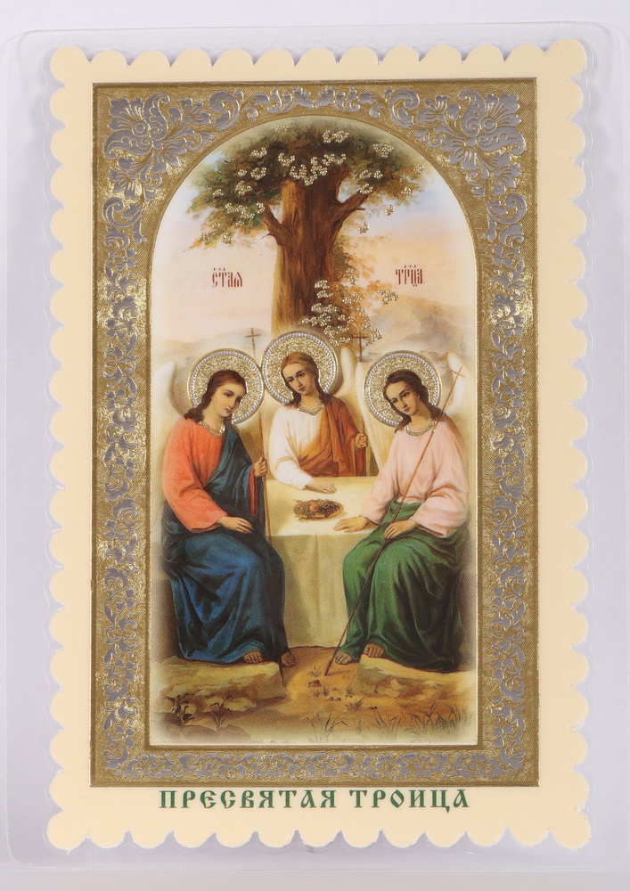 Икона в жесткой ламинации 8х11 с оборотом, двойное тиснение, высечка Троица 3