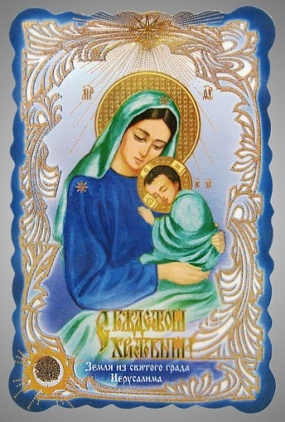Икона в жесткой ламинации 8х11 с оборотом, тиснение, высечка, частица земли Рождество Христово 34