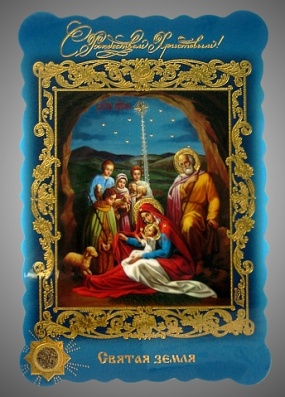 Икона в жесткой ламинации 8х11 с оборотом, тиснение, высечка, частица земли Рождество Христово 44