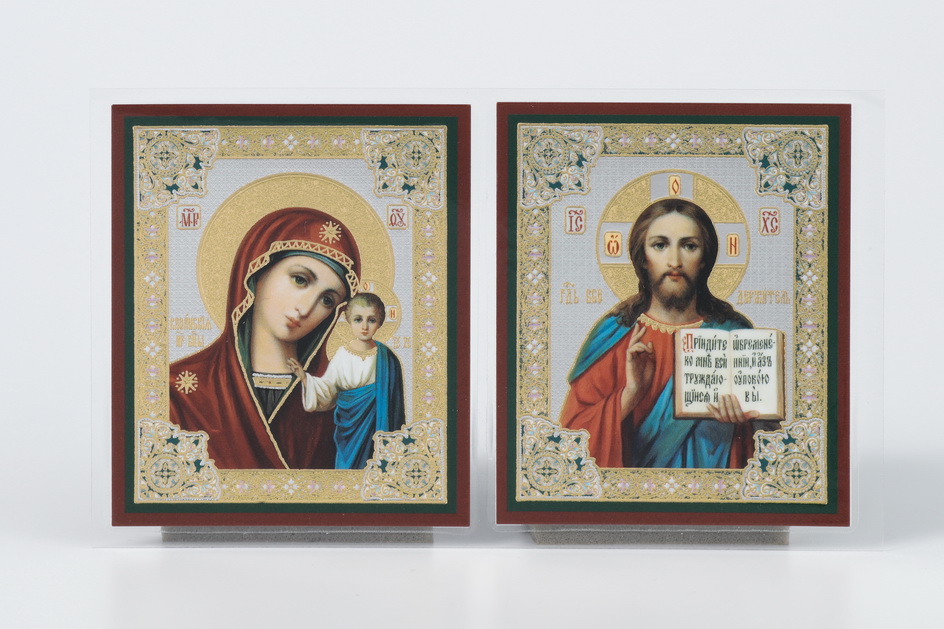 Икона в жесткой ламинации складень-двойник 7х12 двойное тиснение Спаситель-Казанская БМ 14