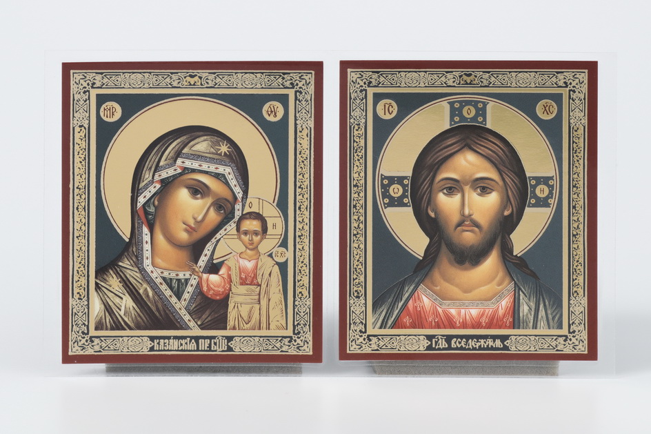 Икона в жесткой ламинации складень-двойник 7х12 двойное тиснение Спаситель-Казанская БМ 29