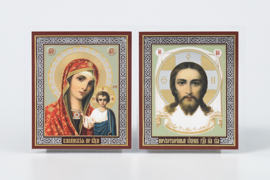 Икона в жесткой ламинации складень-двойник 7х12 двойное тиснение Спаситель-Казанская БМ 31