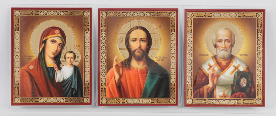 Икона в жесткой ламинации складень-тройник 7х18 двойное тиснение Спаситель-Казанская БМ-Н.Чудотворец 30