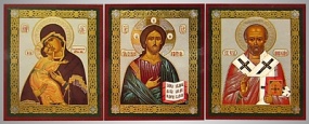 Икона в жесткой ламинации складень-тройник 7х18 двойное тиснение Спаситель-Владимирская БМ-Ник.Чудотворец 4
