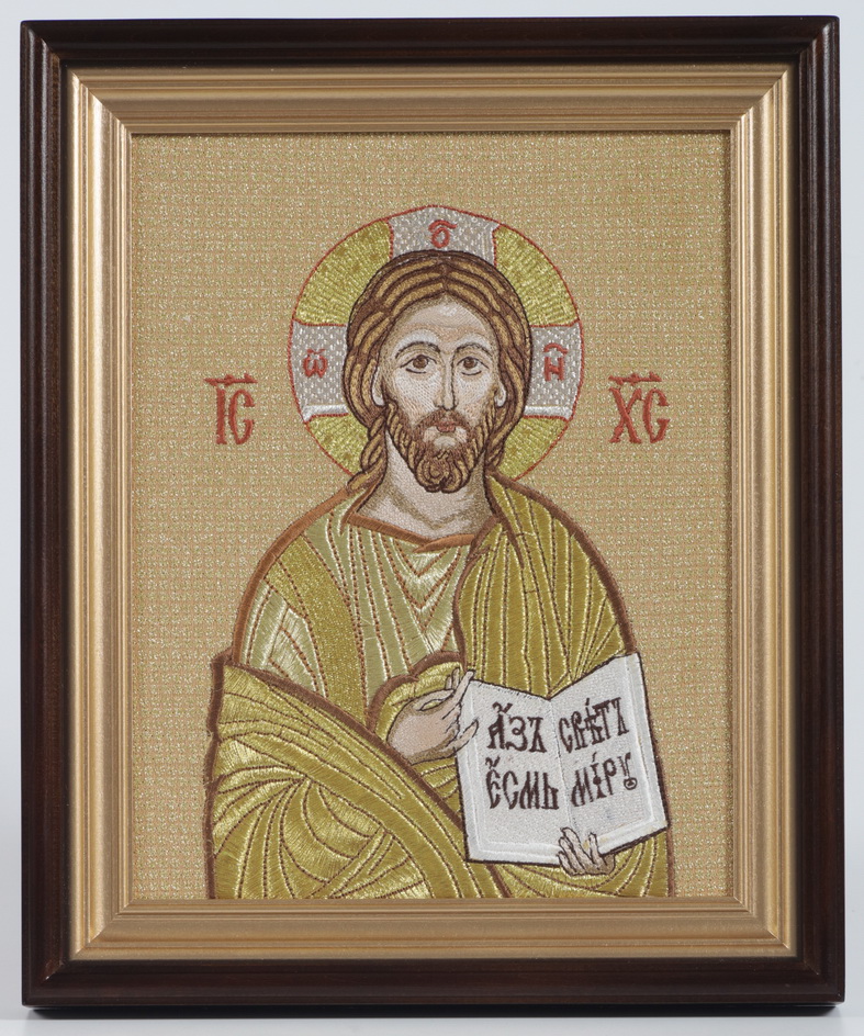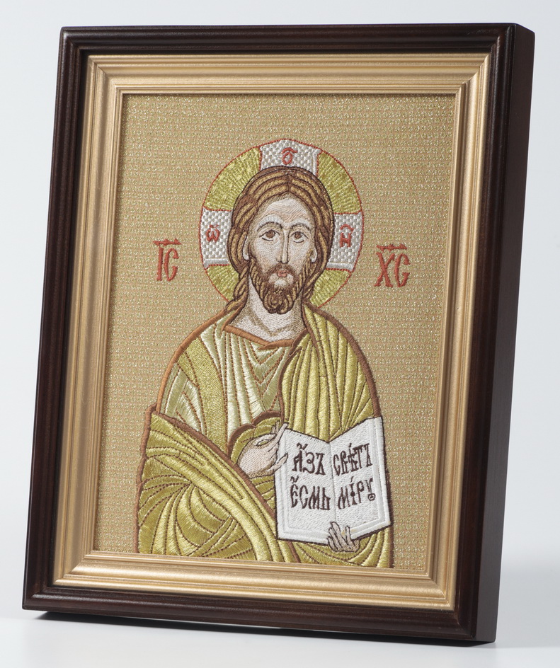 Вышитая икона в деревяннойм киоте.