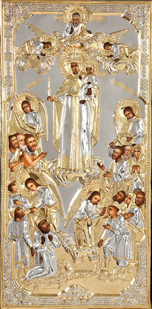Риза изготавливается методом гальванопластики, из-за определенного техпроцесса все габариты и вес изделия могут отличаться. Икона написана на МДФ, которая покрыта левкасом. Риза изготовлена из меди, покрыта никелем и гальваническим золотом (комбинированное золочение). Тыльная сторона ризы обтянута бархатом. По желанию заказчика ризу можно сделать полностью золоченой или полностью покрытой никелем.