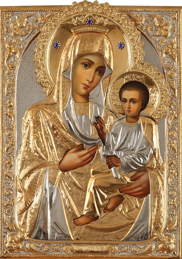 Риза изготавливается методом гальванопластики, из-за определенного техпроцесса все габариты и вес изделия могут отличаться. Икона написана на МДФ, которая покрыта левкасом. Риза изготовлена из меди, покрыта никелем и гальваническим золотом (комбинированное золочение). Тыльная сторона ризы обтянута бархатом. По желанию заказчика ризу можно сделать полностью золоченой или полностью покрытой никелем.