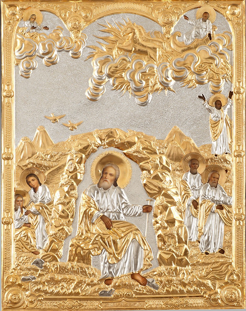 Риза изготавливается методом гальванопластики, из-за определенного техпроцесса все габариты и вес изделия могут отличаться. Икона написана на МДФ, которая покрыта левкасом. Риза изготовлена из меди, покрыта никелем и гальваническим золотом (комбинированное золочение). Тыльная сторона ризы обтянута бархатом. По желанию заказчика ризу можно сделать полностью золоченой или полностью покрытой никелем.