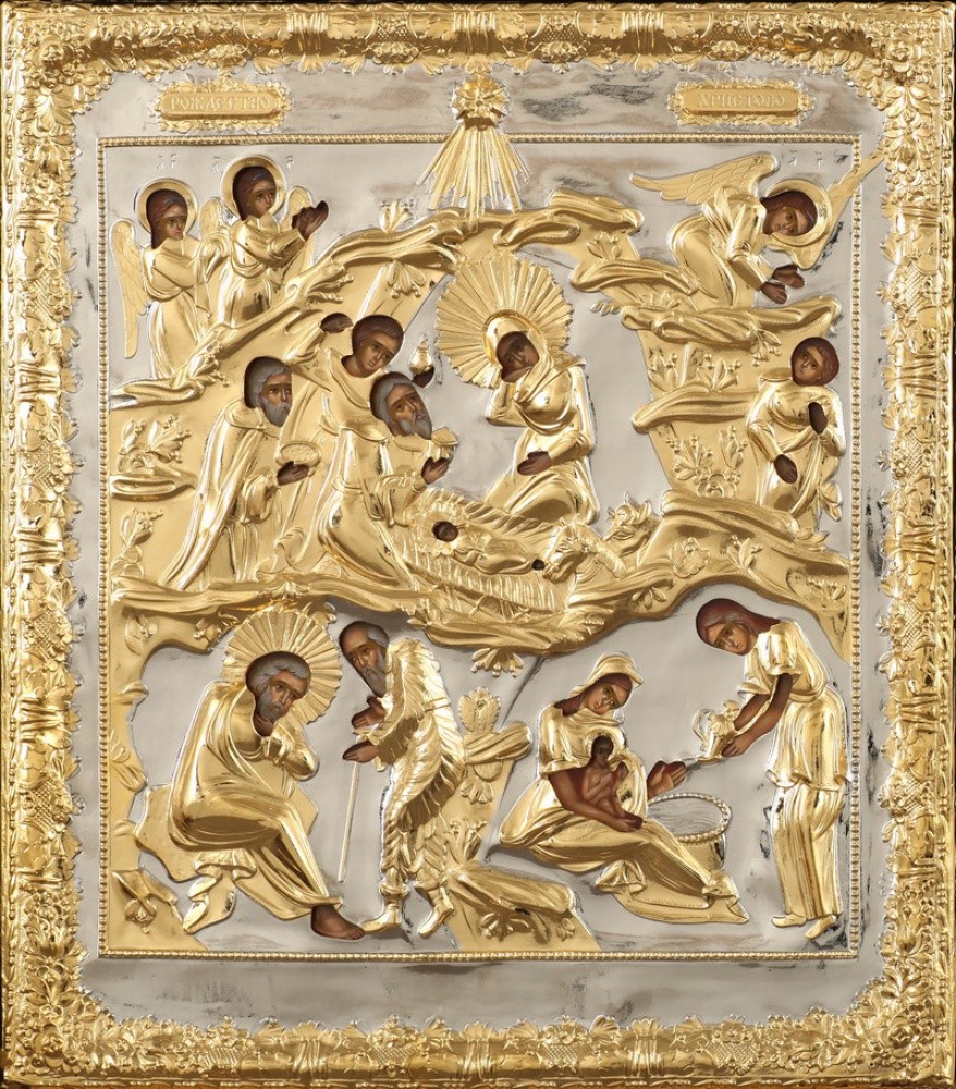 Риза изготавливается методом гальванопластики, из-за определенного техпроцесса все габариты и вес изделия могут отличаться. Икона написана на МДФ, которая покрыта левкасом. Риза изготовлена из меди, покрыта никелем и гальваническим золотом (комбинированное золочение). Тыльная сторона ризы обтянута бархатом. По желанию заказчика ризу можно сделать полностью золоченой или полностью покрытой никелем.