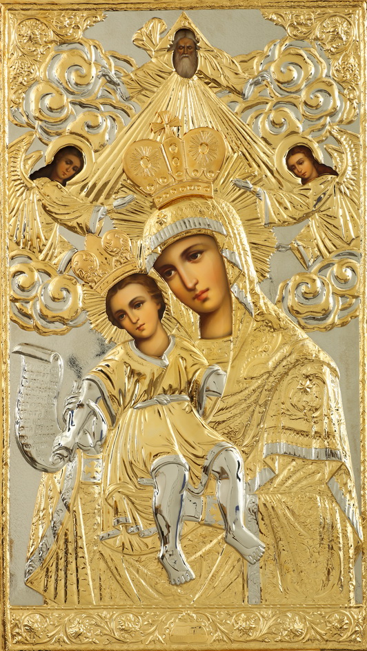 Риза изготавливается методом гальванопластики, из-за определенного техпроцесса все габариты и вес изделия могут отличаться. Икона написана на МДФ, которая покрыта левкасом. Риза изготовлена из меди, покрыта никелем и гальваническим золотом (комбинированное золочение). Тыльная сторона ризы обтянута бархатом. По желанию заказчика ризу можно сделать полностью золоченой или полностью покрытой никелем.