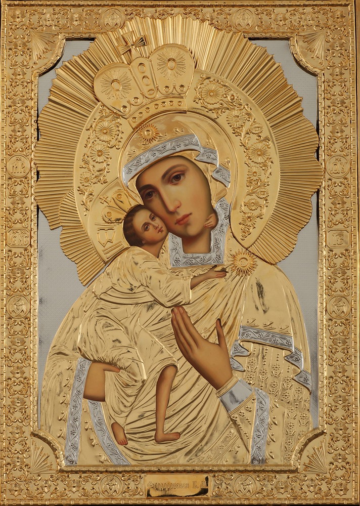 Риза изготавливается методом гальванопластики, из-за определенного техпроцесса все габариты и вес изделия могут отличаться. Икона написана на МДФ, которая покрыта левкасом. Риза изготовлена из меди, покрыта никелем и гальваническим золотом (комбинированное золочение). Тыльная сторона ризы обтянута бархатом. По желанию заказчика ризу можно сделать полностью золоченой или полностью покрытой никелем.