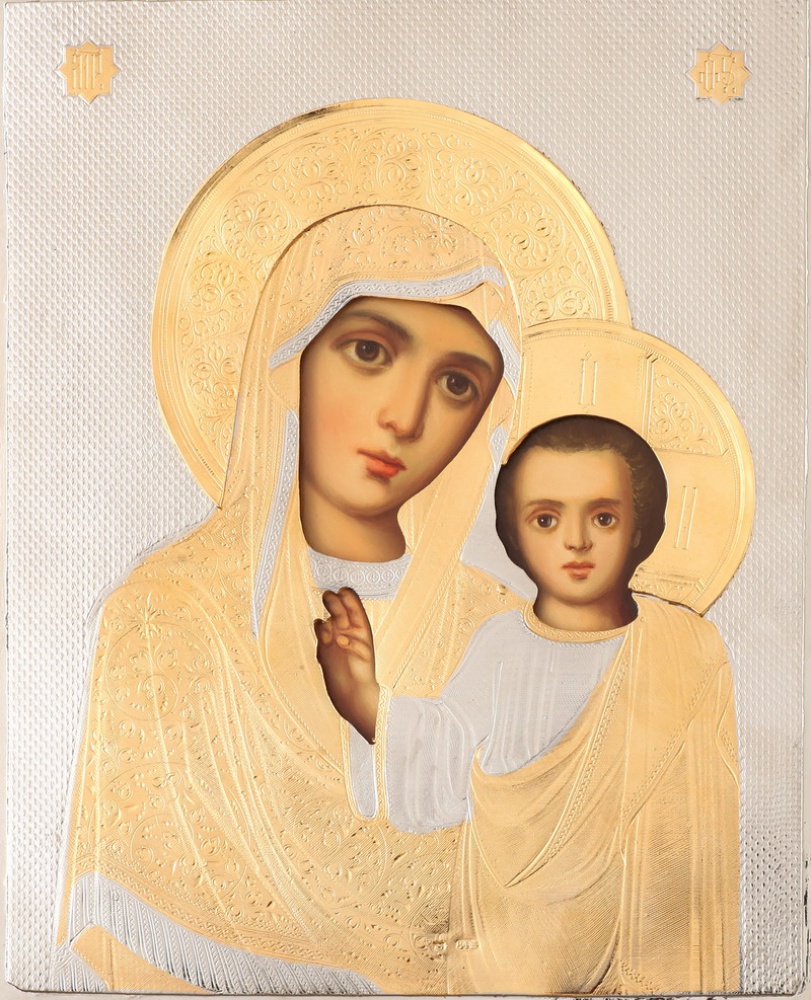 Риза изготавливается методом гальванопластики, из-за определенного техпроцесса все габариты и вес изделия могут отличаться. Икона написана на МДФ, которая покрыта левкасом. Риза изготовлена из меди, покрыта никелем и гальваническим золотом (комбинированное золочение). Тыльная сторона ризы обтянута бархатом. По желанию заказчика ризу можно сделать полностью золоченой или полностью покрытой никелем.