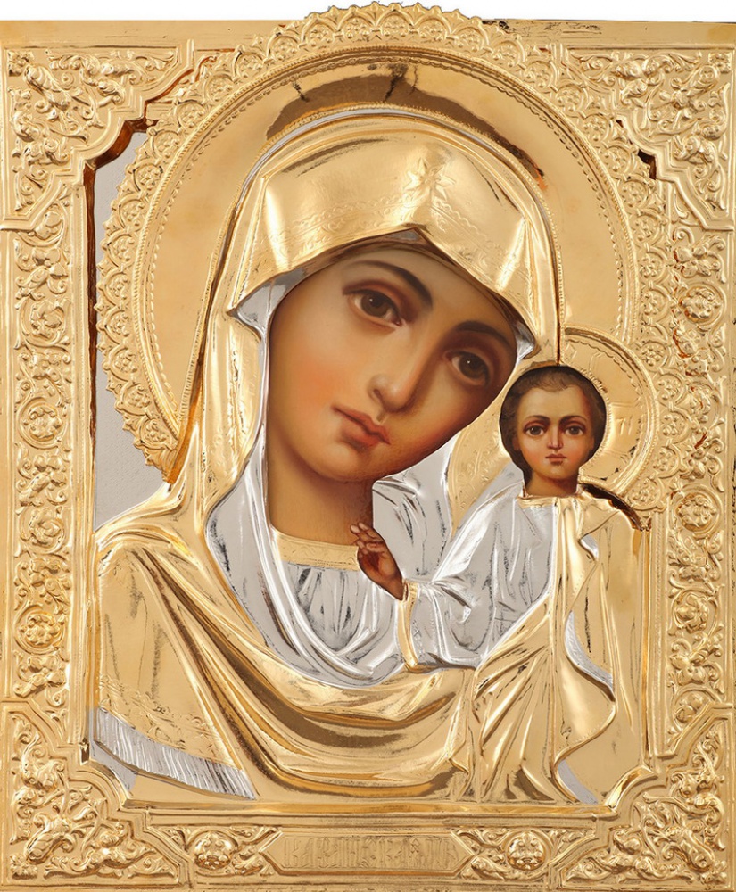 Риза изготавливается методом гальванопластики, из-за определенного техпроцесса все габариты и вес изделия могут отличаться. Икона написана на МДФ, которая покрыта левкасом. Риза изготовлена из меди, покрыта никелем и гальваническим золотом (комбинированное золочение). Тыльная сторона ризы обтянута бархатом. По желанию заказчика ризу можно сделать полностью золоченой или полностью покрытой никелем.