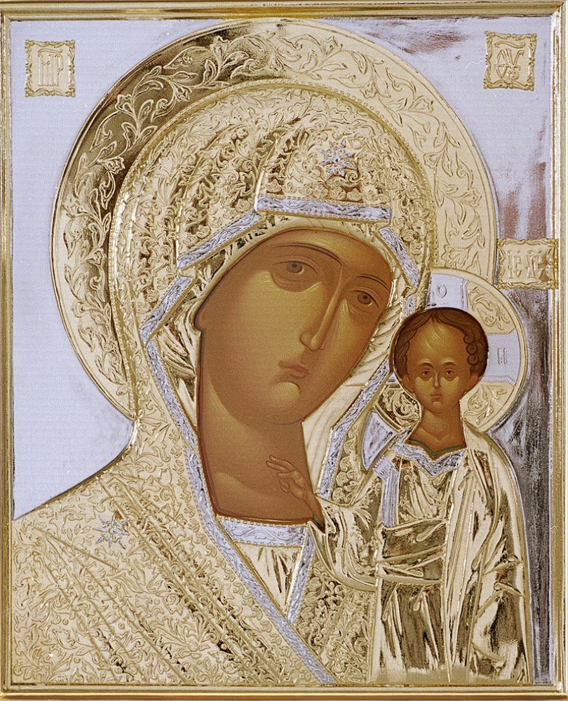 Риза изготавливается методом гальванопластики, из-за определенного техпроцесса все габариты и вес изделия могут отличаться. Икона написана на МДФ, которая покрыта левкасом. Риза изготовлена из меди, покрыта никелем и гальваническим золотом (комбинированное золочение). Тыльная сторона ризы обтянута бархатом. По желанию заказчика ризу можно сделать полностью золоченой или полностью покрытой никелем.