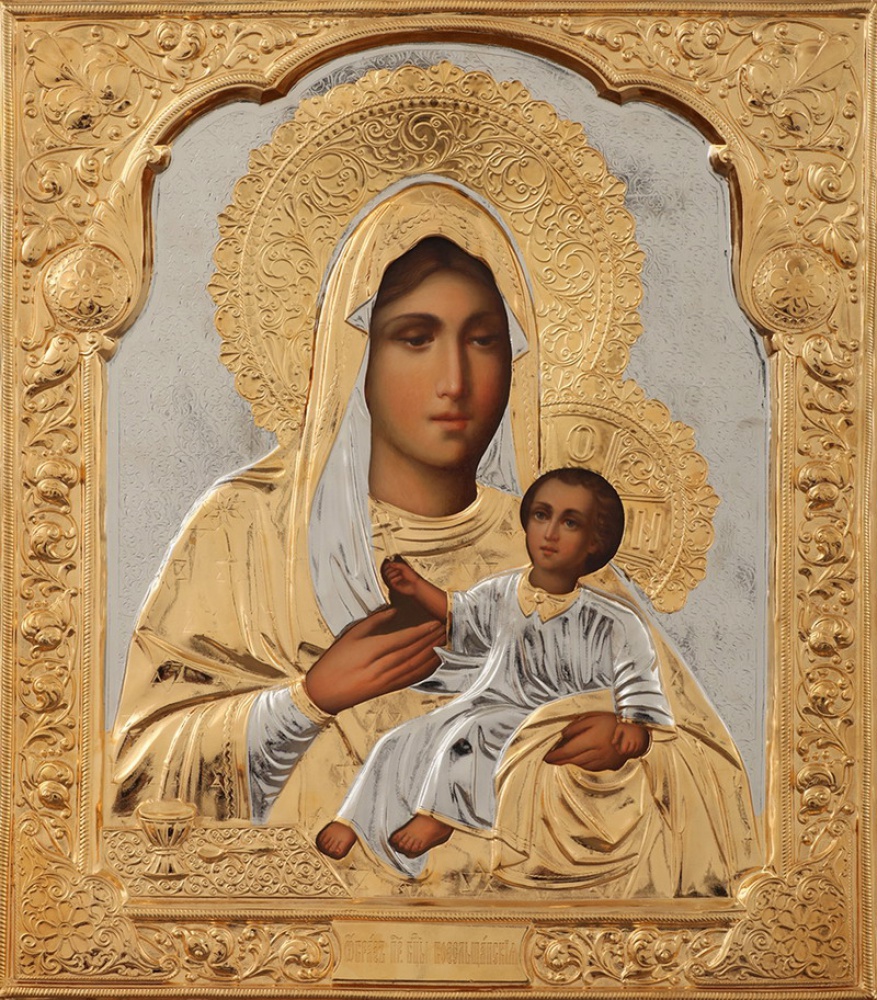Риза изготавливается методом гальванопластики, из-за определенного техпроцесса все габариты и вес изделия могут отличаться. Икона написана на МДФ, которая покрыта левкасом. Риза изготовлена из меди, покрыта никелем и гальваническим золотом (комбинированное золочение). Тыльная сторона ризы обтянута бархатом. По желанию заказчика ризу можно сделать полностью золоченой или полностью покрытой никелем.