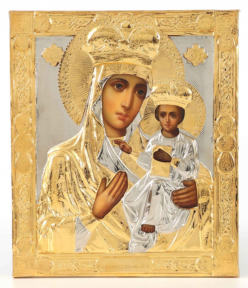 Риза изготавливается методом гальванопластики, из-за определенного техпроцесса все габариты и вес изделия могут отличаться. Икона написана на МДФ, которая покрыта левкасом. Риза изготовлена из меди, покрыта никелем и гальваническим золотом (комбинированное золочение). Тыльная сторона ризы обтянута бархатом. По желанию заказчика ризу можно сделать полностью золоченой или полностью покрытой никелем.