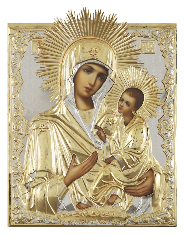 Риза изготавливается методом гальванопластики, из-за определенного техпроцесса все габариты и вес изделия могут отличаться. Икона написана на МДФ, которая покрыта левкасом. Риза изготовлена из меди, покрыта никелем и гальваническим золотом (комбинированное золочение). Тыльная сторона ризы обтянута бархатом. По желанию заказчика ризу можно сделать полностью золоченой или полностью покрытой никелем.