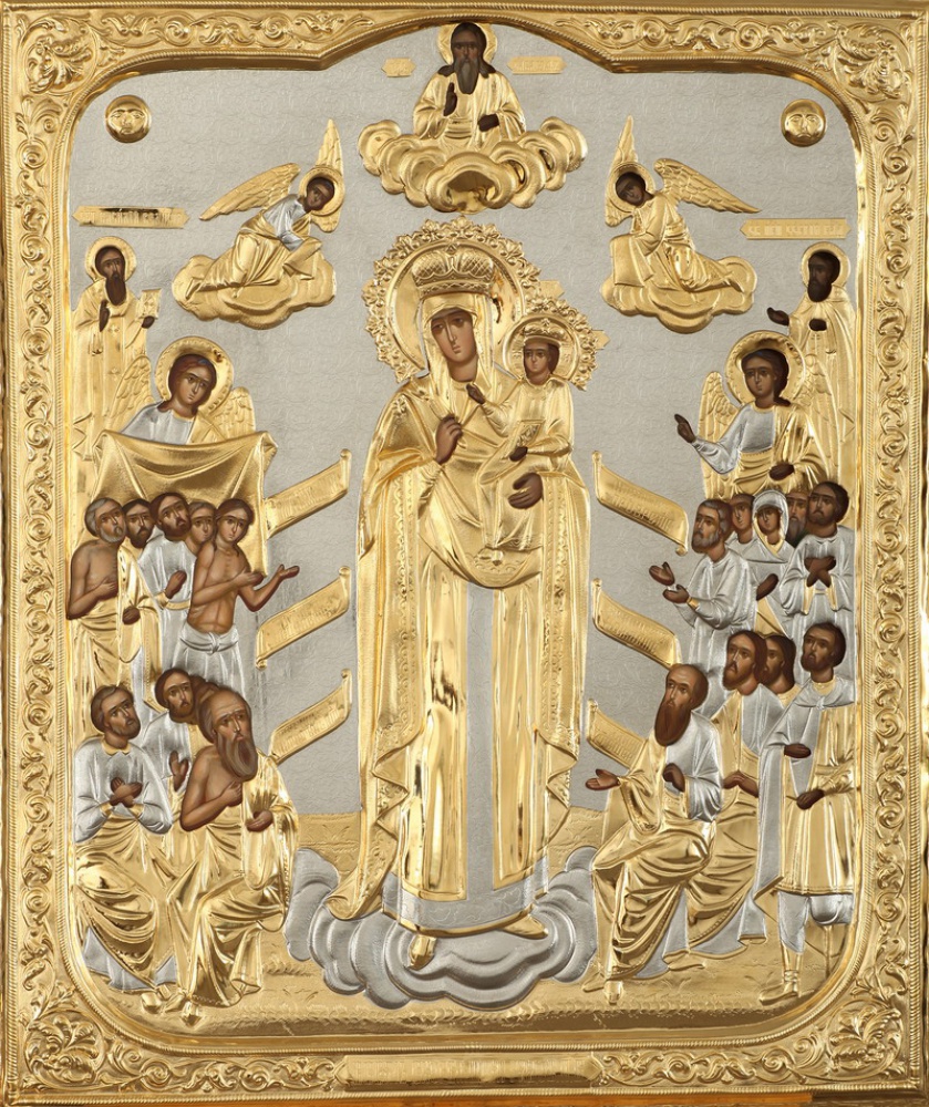 Риза изготавливается методом гальванопластики, из-за определенного техпроцесса все габариты и вес изделия могут отличаться. Икона написана на МДФ, которая покрыта левкасом. Риза изготовлена из меди, покрыта никелем и гальваническим золотом (комбинированное золочение). Тыльная сторона ризы обтянута бархатом. По желанию заказчика ризу можно сделать полностью золоченой или полностью покрытой никелем.