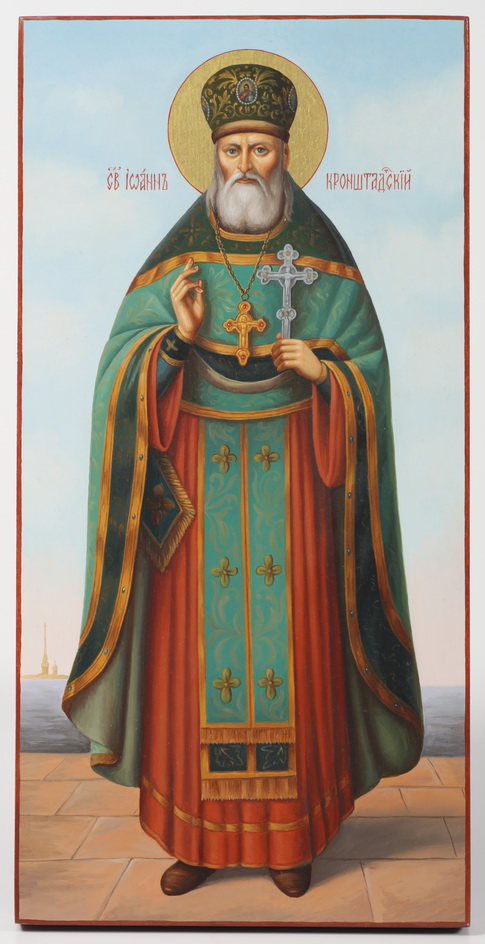 Икона живописная на доске 18х36 масло, золоченый нимб Иоанн Кронштадтский
