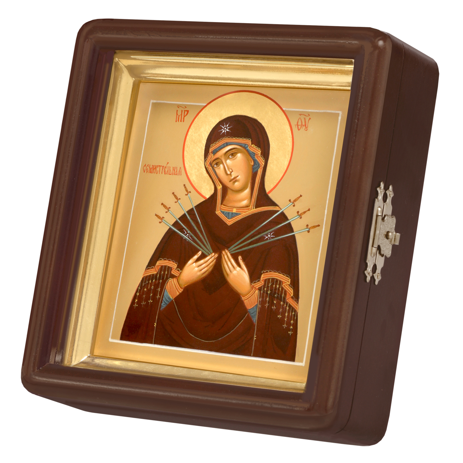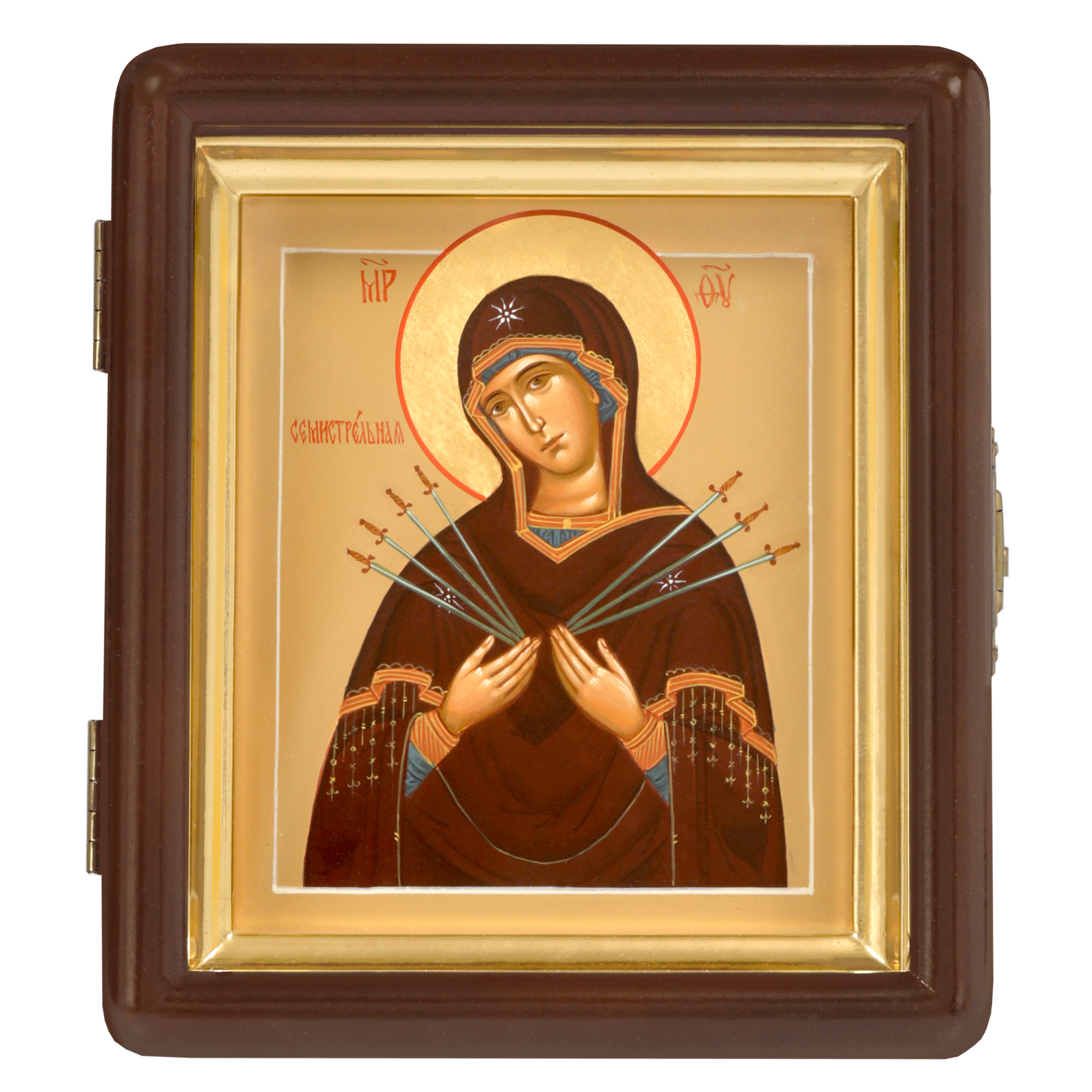 Икона живописная на доске в киоте 11х13 темпера, золоченый нимб, ковчег, киот №1 Семистрельная БМ, 04962